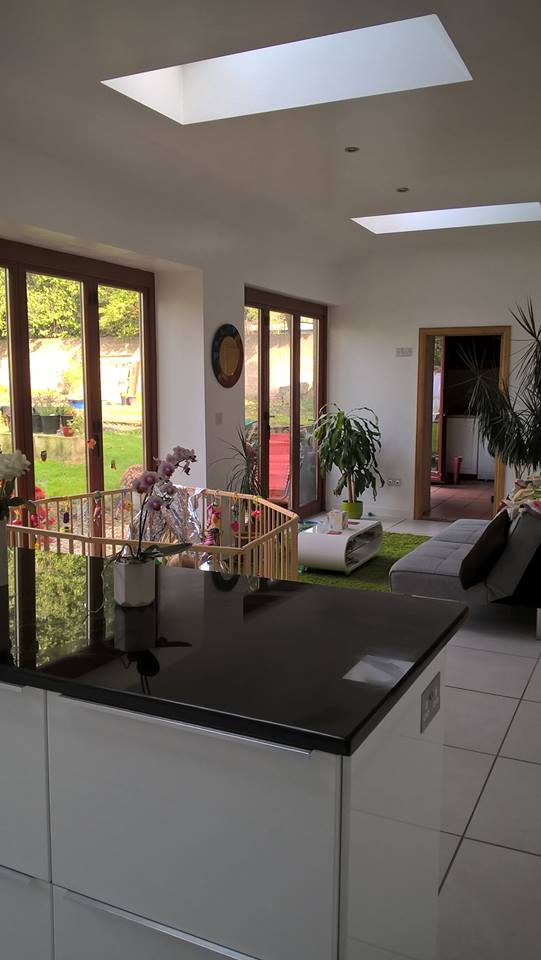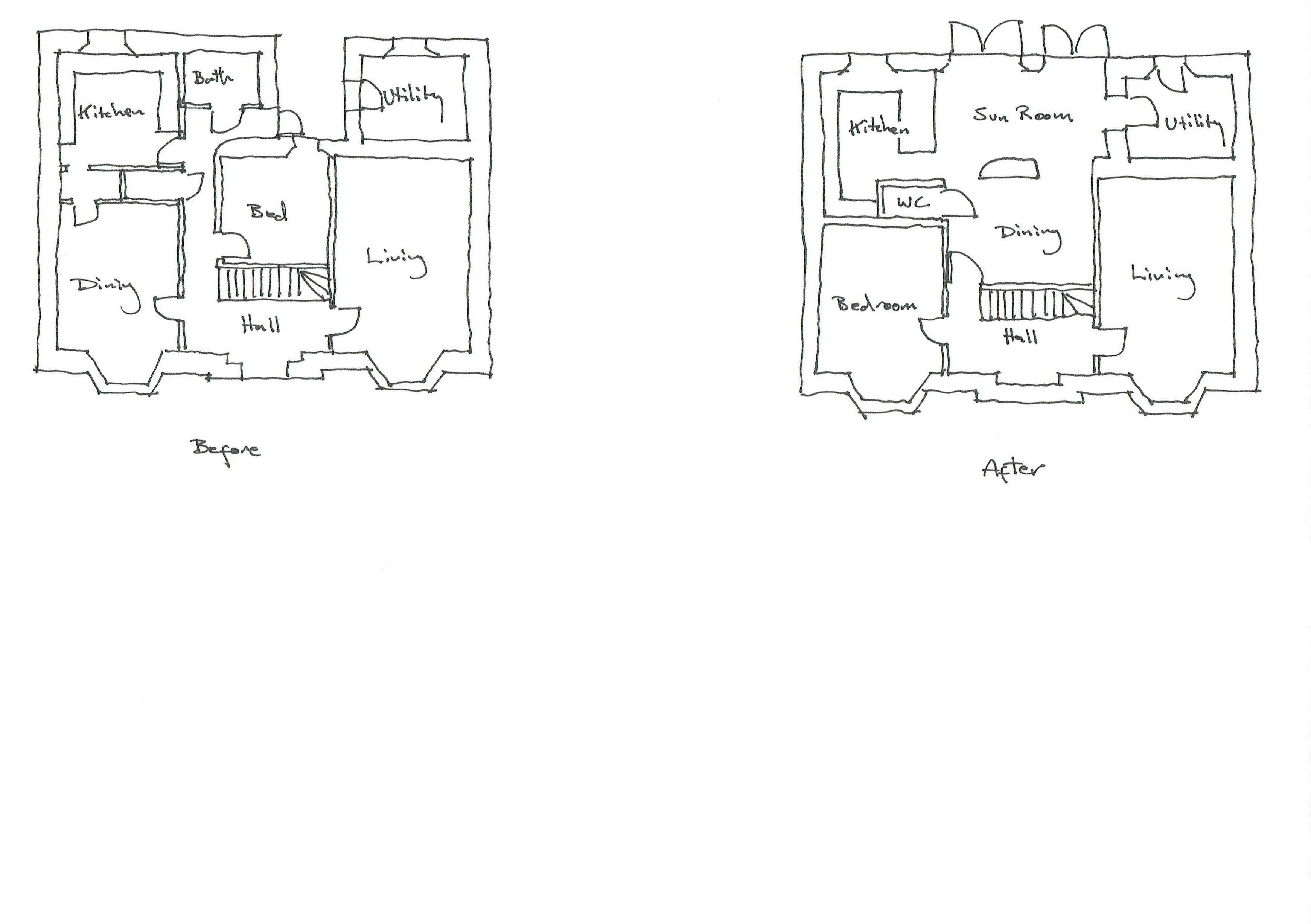 The owners bought a large, 3 bedroom house in a conservation area which was in a poor state of repair, with the intention of renovating and extending. There was a dark kitchen in a lean-to extension to the rear with a shower room and covered porch. We extended the Kitchen into the covered porch and bathroom and introduced large glazed doors opening onto the garden to fill the kitchen / dining / living room with light. Several rooflights also ensured that this space is light all year round. The result was a transformation from the darkest part of the house, to the sun-filled heart of the home.